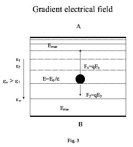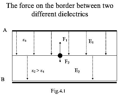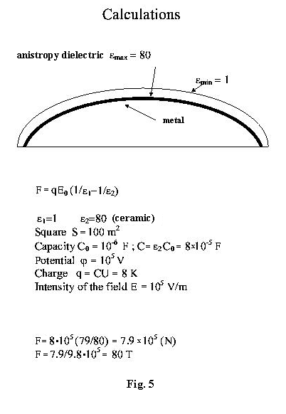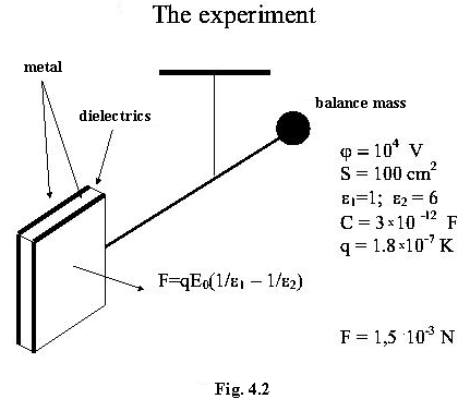 Let's consider some experiment, Fig.4.2. The base of the design is dielectric of permittivity 6 and second layer is dielectric of permittivity 1. The square of the plate is 100 square cm. The high potential direct current source is self-made design. The potential difference is about 10 kV. The calculated active force should be about 0.001 N or 150 mg that was detected by means of rotation torsion effect.